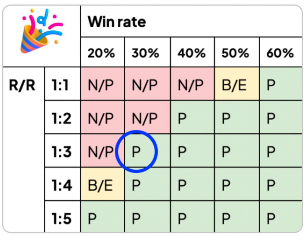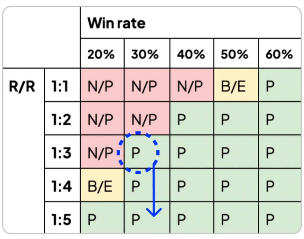 Two factors influence the profit: win rate and the risk/reward ratio (R/R). These two parameters determine whether your trading activity is profitable (P), breakeven (B/E), or not profitable (N/P).
