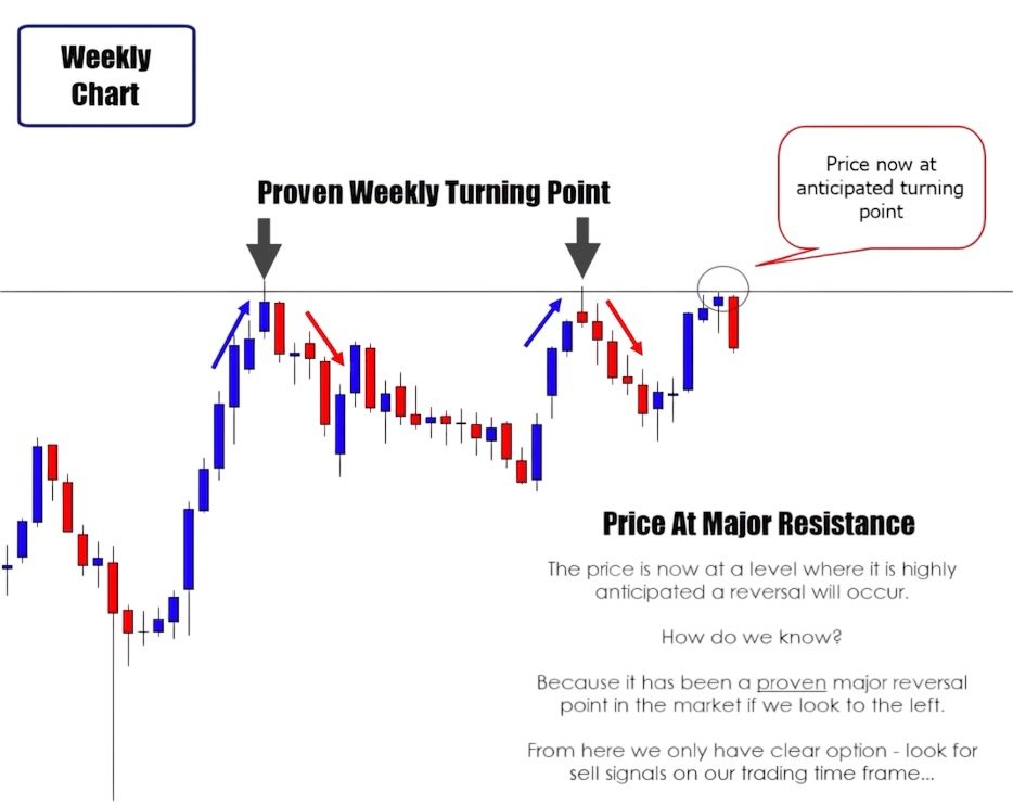 As a price action trader, you should switch to the daily time frame to search for a selling opportunity. If you can identify a price action setup near the weekly resistance level on the daily chart, this would be a high-probability setup worth considering.